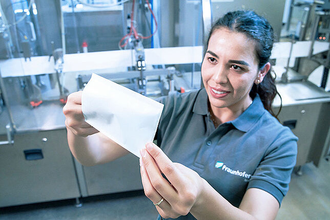 Mit einem leistungsstarken Konzept des Fraunhofer IVV können Verpackungsunternehmen ultradünne Barriereschichten durch Transfermetallisierung auf Papier und biobasierten Folien aufbringen. © Fraunhofer IVV