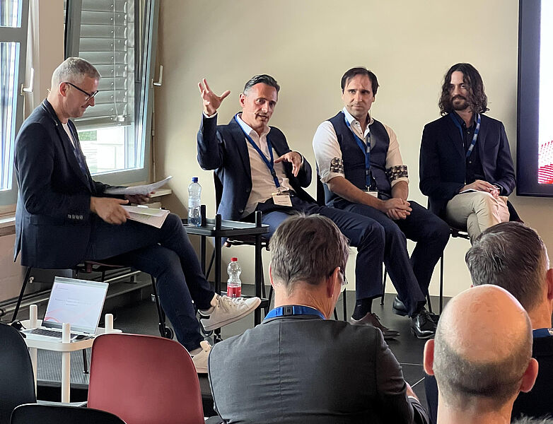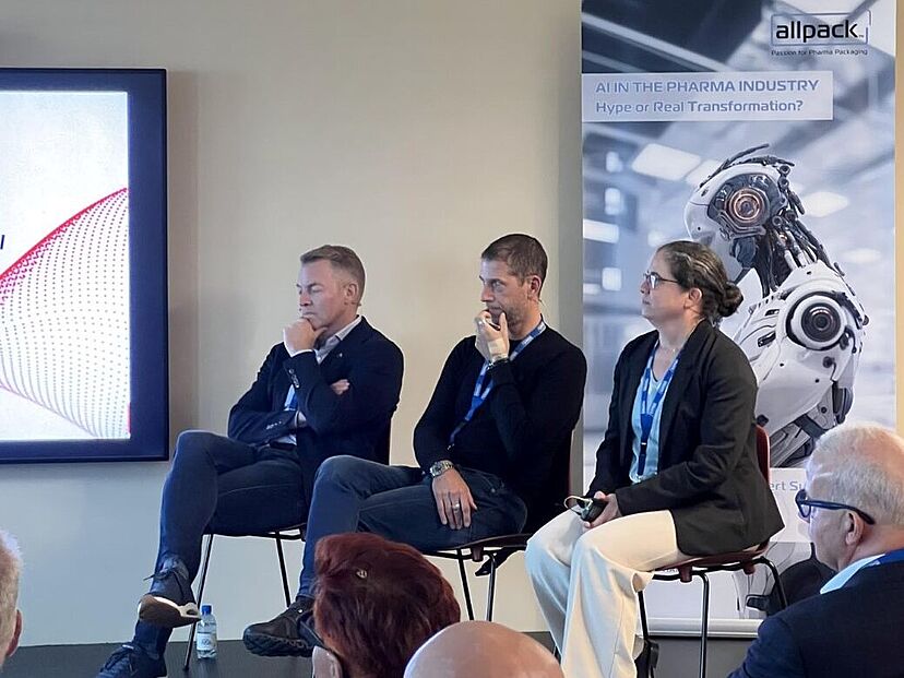 Podiumsdiskussion mit allen Referenten zu Wahrnehmung und Fortschritt beim Einsatz von KI in der Pharmaindustrie. Links: Christoph Staub, Marco Colucci, Chris West und Nino Mandela Bachmann. © Aallpack Group