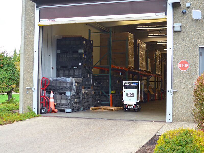 Der «Cartken Hauler» unterstützt im Lager mit einer Nutzlast bis ca. 300 kg für automatisierte Logistik- und Materialtransporte im Innen- und Aussenbereich. Türen und Tore stellen dabei kein Hindernis dar. © Cartken
