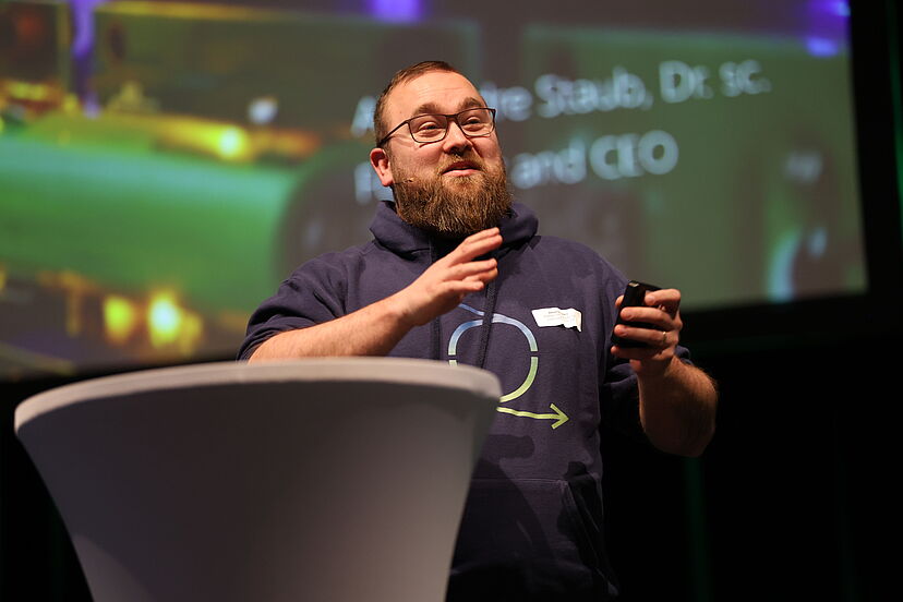 Evolium Technologies SA aus Sion (VS) gewann den Circular Award 2026 mit einer industriellen Lösung zur Wiederaufbereitung von Lithiumionen-Batterien. Alexandre Staub, Gründer und CEO, konnte mit seinem Pitch-Talk überzeugen. Foto: Swiss Recycle