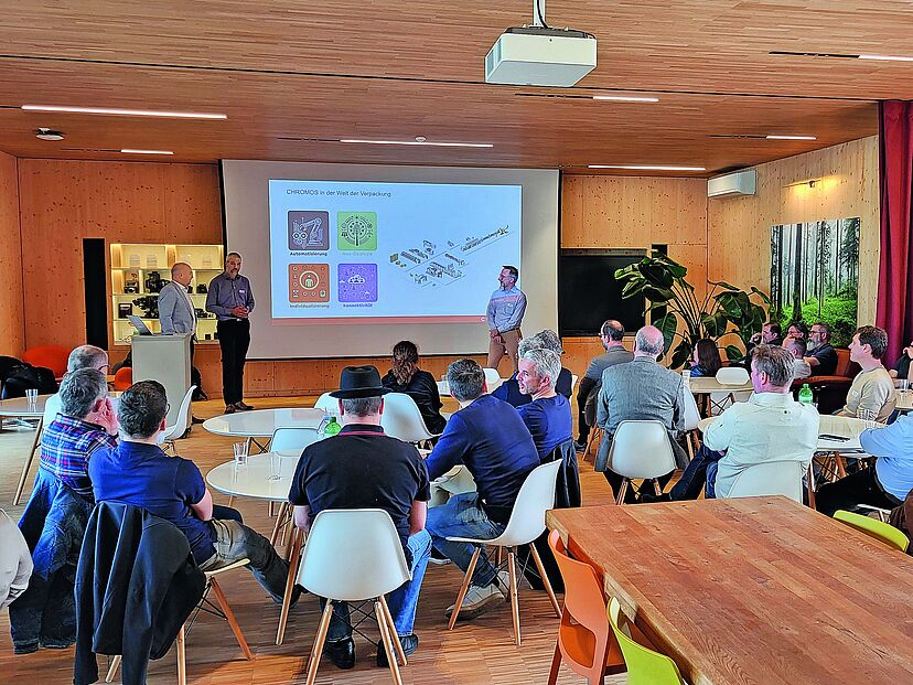 Die Chromos Group, ein familiengeführtes Unternehmen mit Sitz in Dielsdorf und rund 170 Mitarbeitenden, empfing die Teilnehmenden im firmeneigenen Democenter. Nach einer kurzen Begrüssung präsentierten drei Experten von Chromos – Adrian Meyer, Walter Weber und Alexander Link – die vielfältigen Geschäftsbereiche wie Printing, Packaging, Industrial sowie Web Cleaning und Service.