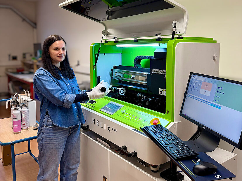 Konische Behälter, wie diese Metallflaschen, können mit der Helix One bedruckt werden. © Koller Media
