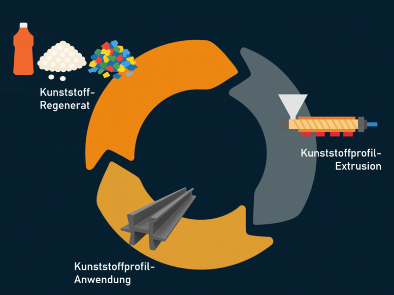 Regranulat, z. B. aus Verpackungskunststoff kann extrudiert und zu Kunststoffprofilen verarbeitet werden. An ihrem Lebensende können die Profile wieder in den Kreislauf zurückgeführt werden. © Rebecca Ragaz K-Profile AG