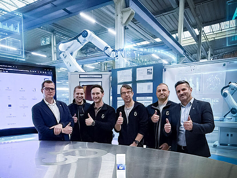 Das Projektteam von Koenig & Bauer Industrial entwickelte ‘Industrial Nexus’ – eine lizenzfreie Plattform zur Digitalisierung des Arbeitsalltags in der Produktion: (v.l.n.r.) Stefan Eibel und Felix Schmitt, beide Fertigungsprozessgestaltung, Bastian Ballmann, Leiter Maschineninstandhaltung, Jochen Eitel, Vorarbeiter Maschineninstandhaltung, Oliver Rützel, Leiter Fertigungsprozessgestaltung, und Samuel Deener, Werkleiter (Fotomontage unter Einsatz von KI). Foto: Koenig & Bauer